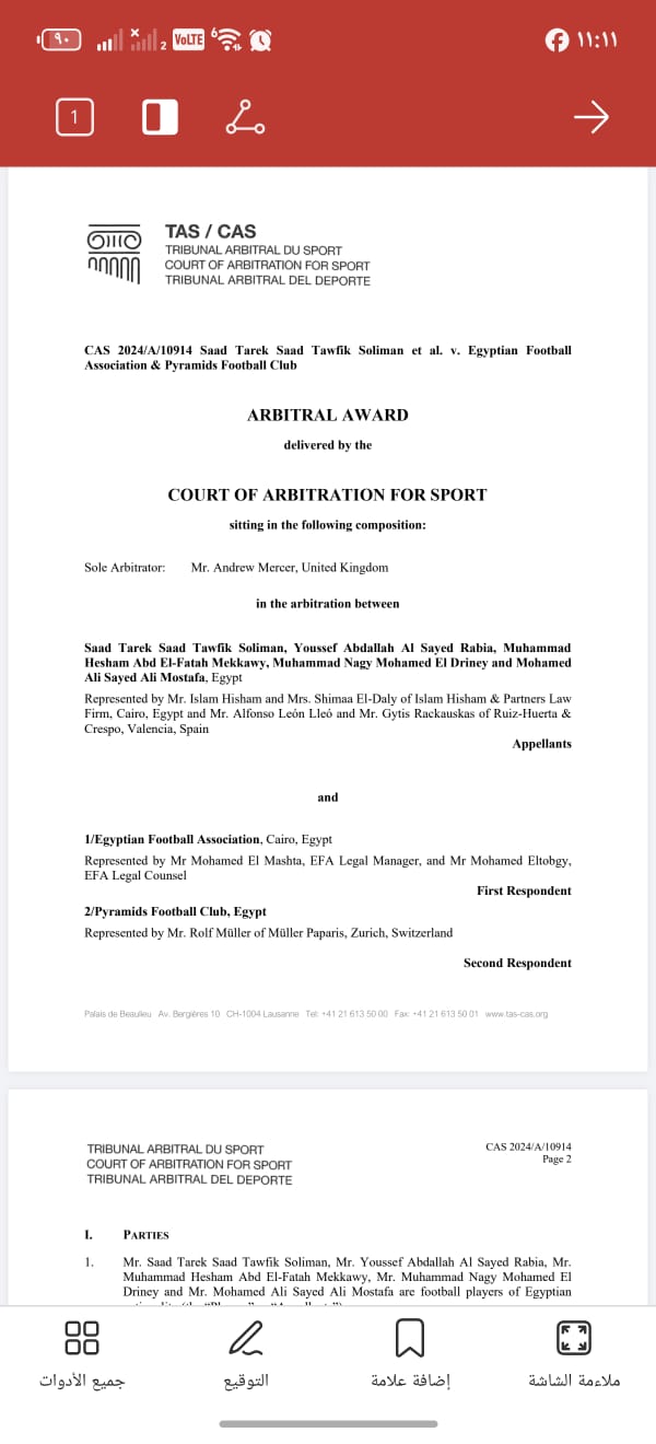 المحكمة الرياضية الدولية “كاس” تحكم بعدم قبول استئناف “الولاد”علي قرار لجنة شئون اللاعبين باتحاد الكرة وتؤكد صحة موقف بيراميدز
