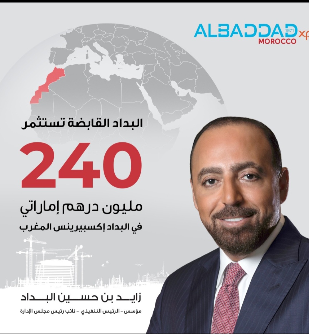 أعلن زايد البداد، الرئيس التنفيذي لمجموعة البداد القابضة، عن استثمار بقيمة 240 مليون درهم إماراتي في شركة البداد إكسبيرينس – المغرب، المتخصصة في حلول الفعاليات، والقاعات المتنقلة، والمعدات، وذلك ضمن استراتيجية المجموعة للتوسع الإقليمي وتعزيز حضورها في الأسواق الأفريقية.