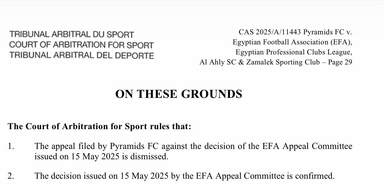 نص قرار المحكمة الرياضية الدولية جاء حرفيا بتأييد قرار لجنة التظلمات باتحاد الكرة المصري والتي أصدرت قرارا في ١٥ مايو ٢٠٢٥ بأن ما حدث كان مخالفا للائحة ولكنها لا تستطيع اتخاذ القرار المناسب لأن مجلس إدارة رابطة الأندية المحترفة حصن قراراته من الطعن عليها أمام أي من الجهات القضائية أو جهات الطعن.